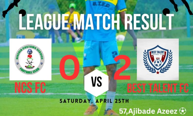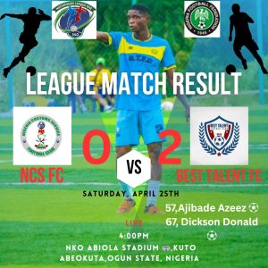 It was another clean bill of health for one of the leading Nigeria Nationwide League One (NLO1), Best Talent FC of Mowe, today, 25th April, 2026 recorded a resounding 2-0 victory over Nigeria Customs Service Football Club at MKO Abiola Stadium, Kuto, Abeokuta, Ogun State.