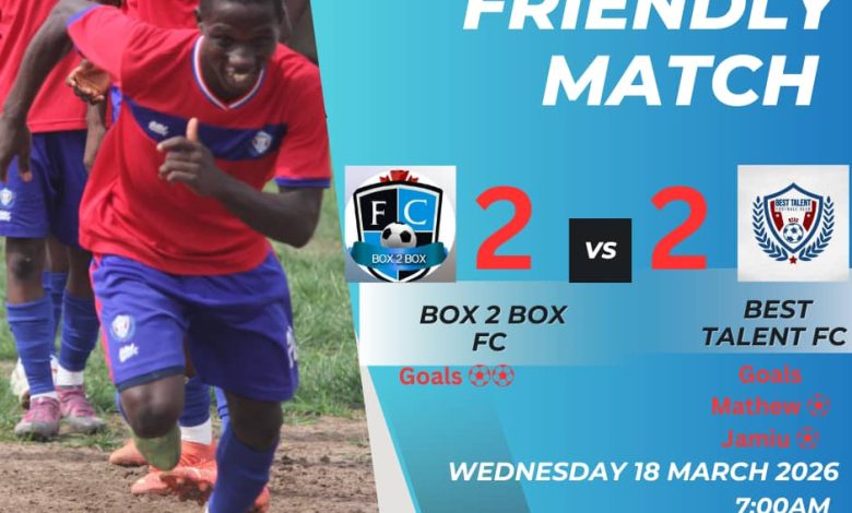 Best Talent Football Club of Mowe on Wednesday were forced to a 2 all draw by a Lagos based side, Box 2 Box in a friendly match held at the Legacy Pitch of the National Stadium, Surulere, Lagos.