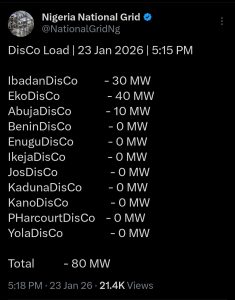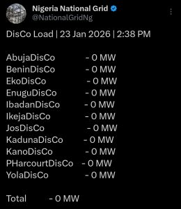 The grid with is the aggregate source of power generation and distribution across the the 11 Distribution Companies (DISCOS) confirmed the latest status of power supply in the country through it’s ‘x’ handle former known as Twitter.
