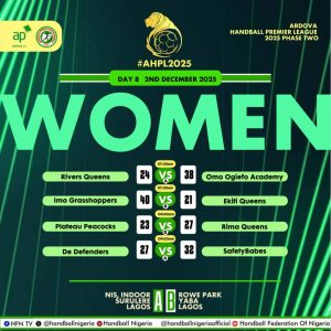 Imo Grasshoppers of Owerri defeated Ekiti Queens 40–21 to record the biggest win in the women’s category on Day 8 of the Ardova Handball Premier League 2025 Phase 2.