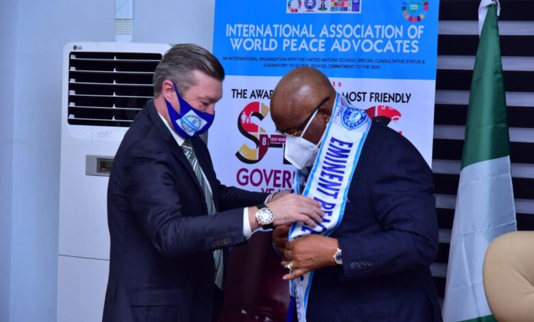 Photo: Governor Hope Uzodimma being Decorated with an Award of the 2020 Most Friendly SDG Governor of the Year in Nigeria by the President International Association of World Peace Advocates, Amb Per Stafsen at the Government House, Owerri