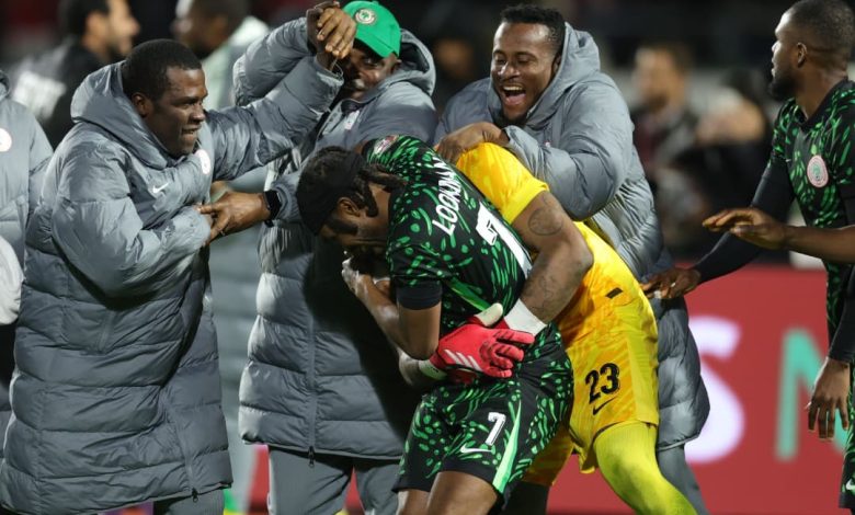PHOTO… Match-Winners: Goalkeeper Stanley Nwabali, who saved two of Egypt’s kicks, lifts Ademola Lookman, who scored Nigeria’s winning penalty, on Saturday.