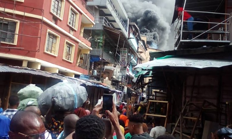 Activities at the ever busy Balogun Street, Idumota, Lagos was disrupted this morning when fire broke out at the last floor of 32 Balogun Street.