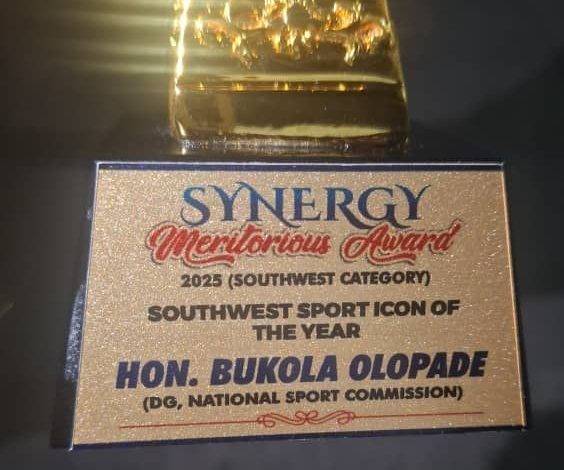 The Director General of the National Sports Commission (NSC), Hon. Bukola Olopade, has been honoured with the prestigious Southwest Sports Icon of the Year Award at the 2025 edition of the Synergy Meritorious Awards.