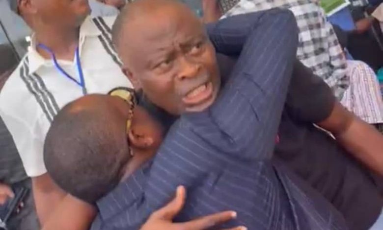Photo: Kunle Soname (right) and Ebi Egbe (Monimichelle) in a warm embrace at the MJA Arena on Sunday