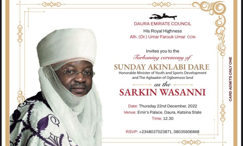 The Minister of Youth and Sports Development, Chief Sunday Dare will on Thursday, December 22, be conferred with the prestigious chieftaincy title of Seriki Wasanni ( King/Leader of Games) by the Daura Emirate Council led by the Emir of Daura, Alhaji Umar Farouk Umar.