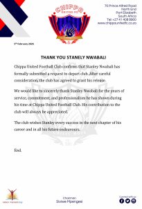 Super Eagles’ No.1 goalkeeper Stanley Nwabali on Thursday announced his departure from South African club Chippa United.