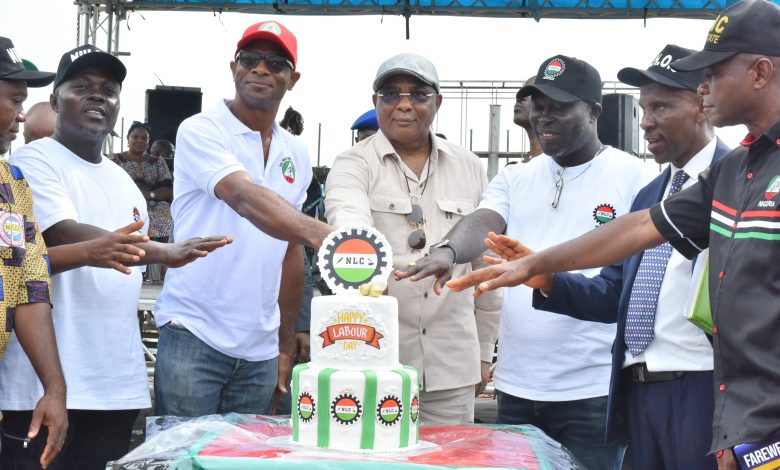 Photo: Imo State Governor, Senator Hope Uzodimma (centre), Chairman Nigeria Labour Congress Imo State Chapter, Comrade Uche Chigemezu Nwigwe (third right), Chairman Trade Union Congress Imo State Chapter, Comrade Uchenna Great Ibe (third left), Head of Service Imo State, Barr Raymond Ucheoma (second right) and other labour leaders cutting the cake to mark the 2024 Workers Day celebration held at Rear Admiral Ndubuisi Kanu Square, Owerri…