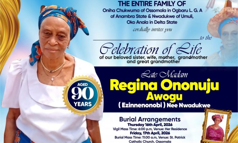 The family of veteran sports broadcaster Owelle Felix Awogu, has announced burial arrangements for their late mother Madam Nnedinobi Regina Awogu, aged 90 years.