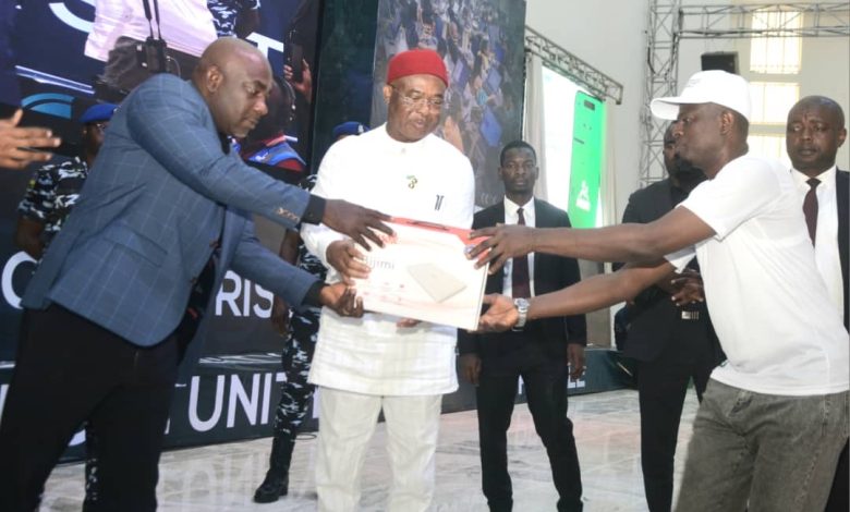 Photo: Governor Hope Uzodimma of Imo State (middle) assisted by the Commissioner for Digital Economy and E-Government, Dr. Chimezie Amadi ( left) hands over a laptop kit to Mr.Modestus Okafor, one of the 10,000 graduates of the Cohort 3 Skill-Up Imo Programme during their graduation at the Emmanuel Iwuanyanwu International Convention Centre Owerri… Saturday.